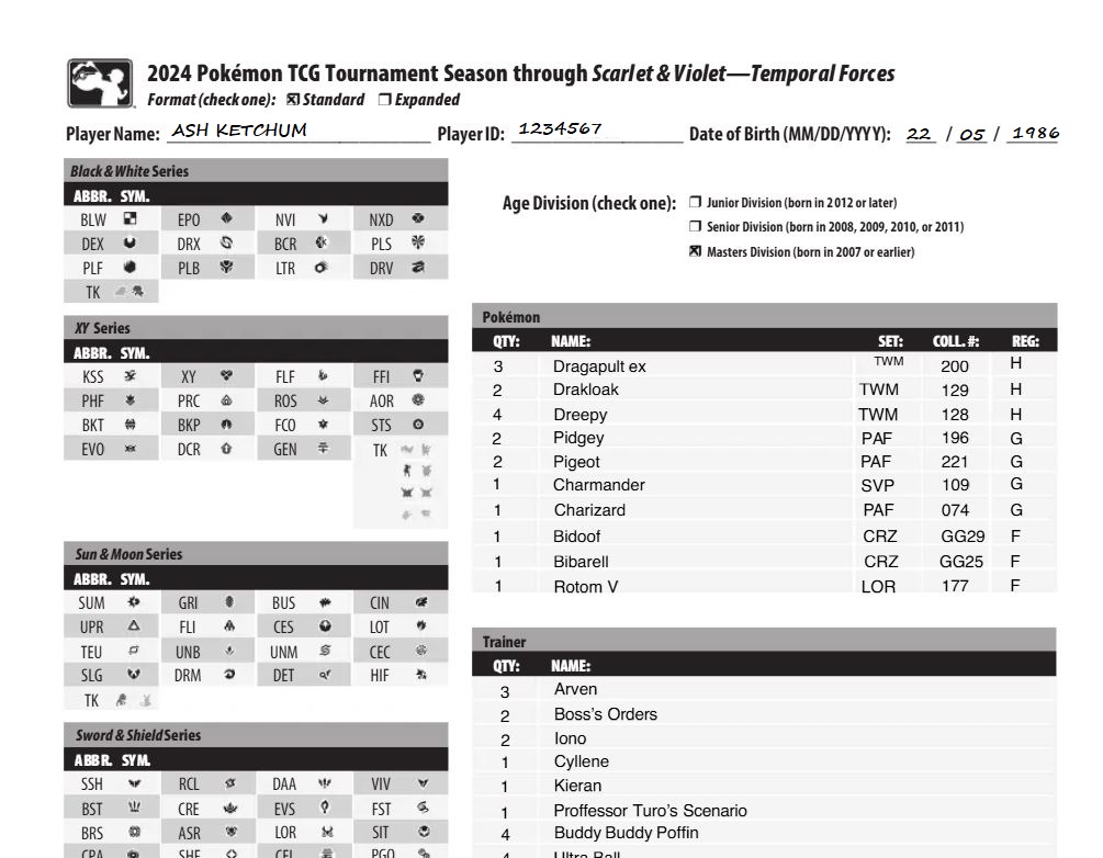 Die Deckliste ist ein Dokument, das dein gesamtes 60 Karten Deck umfasst. Diese Liste wird kurz vor Turnierbeginn beim zuständigen Schiedsrichter / Pokémon-Professor eingereicht.